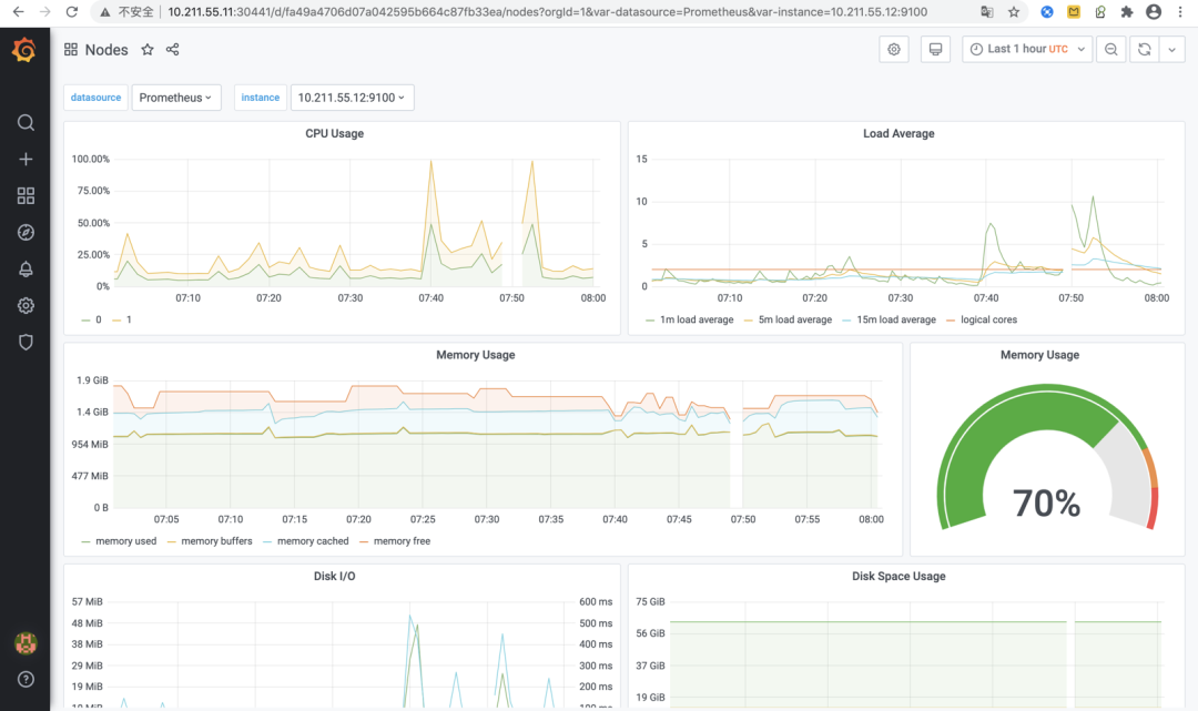 这里我们找一个针对Kubernetes物理节点的“Nodes”监控Dashboard,点击打开后看到的监控效果如下图所示: