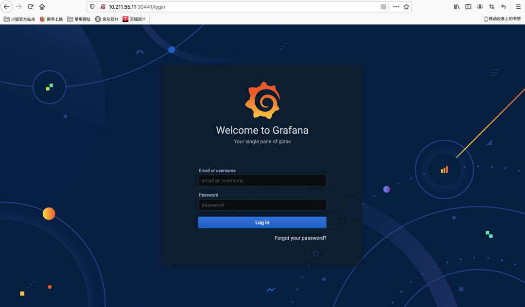 需要注意由于Grafana的应用运行的默认端口为80,为避免实验环境冲突,这里映射时将目标容器端口指定为3000,并最终将节点端口映射为30441。完成后,浏览器输入URL:
