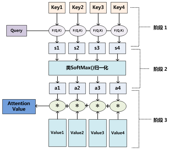可以用下图来展示上述Attention计算过程的三个阶段。