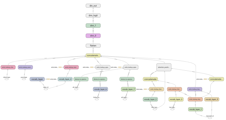 import numpy as npimport datetimeimport itertoolsimport tensorflow as tffrom collections import namedtuple, OrderedDictfrom tensorflow.keras.layers import *import tensorflow.keras.backend as Kfrom tensorflow.keras import layersfrom tensorflow.keras.models import Modelfrom tensorflow.keras.callbacks import TensorBoard#########################################################################################数据预处理####################################################################################### 定义输入数据参数类型SparseFeat = namedtuple('SparseFeat', ['name', 'voc_size', 'hash_size', 'share_embed','embed_dim', 'dtype'])DenseFeat = namedtuple('DenseFeat', ['name', 'pre_embed','reduce_type','dim', 'dtype'])VarLenSparseFeat = namedtuple('VarLenSparseFeat', ['name', 'voc_size','hash_size', 'share_embed', 'weight_name', 'combiner', 'embed_dim','maxlen', 'dtype'])# 筛选实体标签categoricalDICT_CATEGORICAL = {"topic_id": [str(i) for i in range(0, 700)],: [str(i) for i in range(0, 100)],}feature_columns = [SparseFeat(name="topic_id", voc_size=700, hash_size= None,share_embed=None, embed_dim=2, dtype='string'),="keyword_id", voc_size=10, hash_size= None,share_embed=None, embed_dim=2, dtype='string'),='client_type', voc_size=2, hash_size= None,share_embed=None, embed_dim=1,dtype='int32'),='post_type', voc_size=2, hash_size= None,share_embed=None, embed_dim=1,dtype='int32'),="follow_topic_id", voc_size=700, hash_size= None,share_embed='topic_id',weight_name = None, combiner= 'sum', embed_dim=2, maxlen=20,dtype='string'),="all_topic_fav_7", voc_size=700, hash_size= None,share_embed='topic_id', weight_name = 'all_topic_fav_7_weight', combiner= 'sum', embed_dim=2, maxlen=5,dtype='string'),="hist_topic_id", voc_size=700, hash_size= None, share_embed='topic_id', weight_name = None, combiner= None, embed_dim=2, maxlen=5,dtype='string'),="hist_keyword_id", voc_size=10, hash_size= None, share_embed='keyword_id', weight_name = None, combiner= None, embed_dim=2, maxlen=5,dtype='string'),# DenseFeat(name='client_embed',pre_embed='read_post_id', reduce_type='mean', dim=768, dtype='float32'),]# 用户行为序列特征history_feature_names = ['topic_id', 'keyword_id']DEFAULT_VALUES = [[0],[''],[0.0],[0.0], [''],[''],[''], [''],['']]COL_NAME = ['act','client_id','client_type', 'post_type',"topic_id", 'follow_topic_id', "all_topic_fav_7",'hist_topic_id', 'keyword_id', 'hist_keyword_id']def _parse_function(example_proto):item_feats = tf.io.decode_csv(example_proto, record_defaults=DEFAULT_VALUES, field_delim='\t')parsed = dict(zip(COL_NAME, item_feats))feature_dict = {}for feat_col in feature_columns:if isinstance(feat_col, VarLenSparseFeat):if feat_col.weight_name is not None:kvpairs = tf.strings.split([parsed[feat_col.name]], ',').values[:feat_col.maxlen]kvpairs = tf.strings.split(kvpairs, ':')kvpairs = kvpairs.to_tensor()feat_vals = tf.split(kvpairs, num_or_size_splits=2, axis=1)feat_ids = tf.reshape(feat_ids, shape=[-1])feat_vals = tf.reshape(feat_vals, shape=[-1])if feat_col.dtype != 'string':feat_ids= tf.strings.to_number(feat_ids, out_type=tf.int32)feat_vals= tf.strings.to_number(feat_vals, out_type=tf.float32)= feat_ids= feat_valselse:feat_ids = tf.strings.split([parsed[feat_col.name]], ',').values[:feat_col.maxlen]feat_ids = tf.reshape(feat_ids, shape=[-1])if feat_col.dtype != 'string':feat_ids= tf.strings.to_number(feat_ids, out_type=tf.int32)= feat_idselif isinstance(feat_col, SparseFeat):= parsed[feat_col.name]elif isinstance(feat_col, DenseFeat):if not feat_col.is_embed:= parsed[feat_col.name]elif feat_col.reduce_type is not None:keys = tf.strings.split(parsed[feat_col.is_embed], ',')emb = tf.nn.embedding_lookup(params=ITEM_EMBEDDING, ids=ITEM_ID2IDX.lookup(keys))emb = tf.reduce_mean(emb,axis=0) if feat_col.reduce_type == 'mean' else tf.reduce_sum(emb,axis=0)= embelse:emb = tf.nn.embedding_lookup(params=ITEM_EMBEDDING, ids=ITEM_ID2IDX.lookup(parsed[feat_col.is_embed]))= embelse:raise "unknown feature_columns...."label = parsed['act']return feature_dict, labelpad_shapes = {}pad_values = {}for feat_col in feature_columns:if isinstance(feat_col, VarLenSparseFeat):max_tokens = feat_col.maxlen= tf.TensorShape([max_tokens])= '0' if feat_col.dtype == 'string' else 0if feat_col.weight_name is not None:= tf.TensorShape([max_tokens])= tf.constant(-1, dtype=tf.float32)# no need to pad labelselif isinstance(feat_col, SparseFeat):if feat_col.dtype == 'string':= tf.TensorShape([])= '0'else:= tf.TensorShape([])= 0.0elif isinstance(feat_col, DenseFeat):if not feat_col.is_embed:= tf.TensorShape([])= 0.0else:= tf.TensorShape([feat_col.dim])= 0.0pad_shapes = (pad_shapes, (tf.TensorShape([])))pad_values = (pad_values, (tf.constant(0, dtype=tf.int32)))filenames= tf.data.Dataset.list_files([])dataset = filenames.flat_map(lambda filepath: tf.data.TextLineDataset(filepath).skip(1))batch_size = 2dataset = dataset.map(_parse_function, num_parallel_calls=60)dataset = dataset.repeat()dataset = dataset.shuffle(buffer_size = batch_size) # 在缓冲区中随机打乱数据dataset = dataset.padded_batch(batch_size = batch_size,padded_shapes = pad_shapes,padding_values = pad_values) # 每1024条数据为一个batch,生成一个新的Datasetsdataset = dataset.prefetch(buffer_size=tf.data.experimental.AUTOTUNE)# 验证集filenames_val= tf.data.Dataset.list_files(['./user_item_act_test_val.csv'])dataset_val = filenames_val.flat_map(lambda filepath: tf.data.TextLineDataset(filepath).skip(1))val_batch_size = 2dataset_val = dataset_val.map(_parse_function, num_parallel_calls=60)dataset_val = dataset_val.padded_batch(batch_size = val_batch_size,padded_shapes = pad_shapes,padding_values = pad_values) # 每1024条数据为一个batch,生成一个新的Datasetsdataset_val = dataset_val.prefetch(buffer_size=tf.data.experimental.AUTOTUNE)#########################################################################################自定义Layer##################################################################################