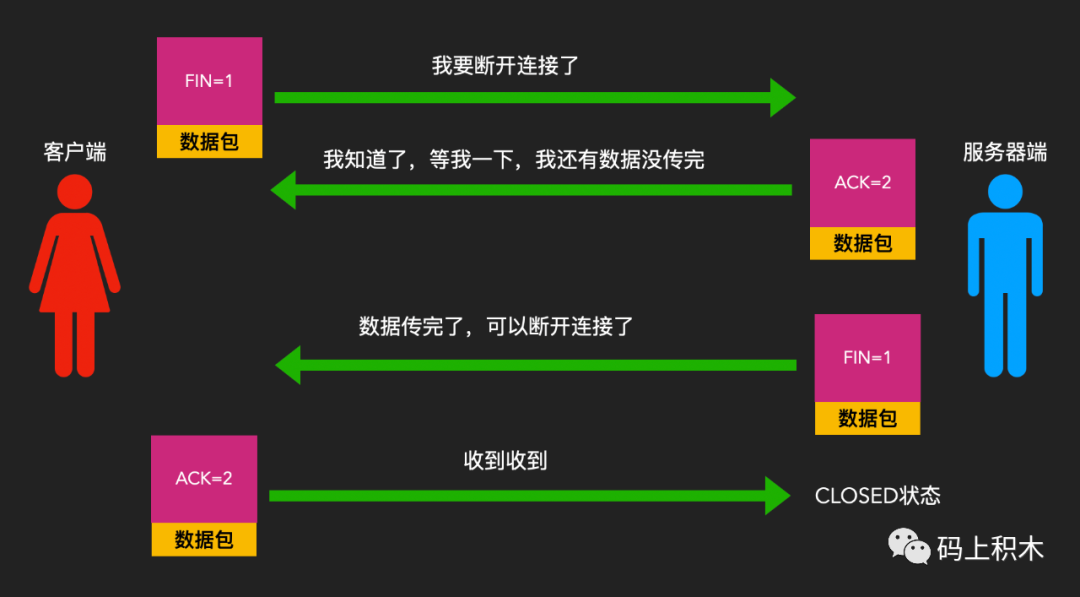 TCP数据包给客户端,头部信息中包括(FIN=1代表要断开连接) -