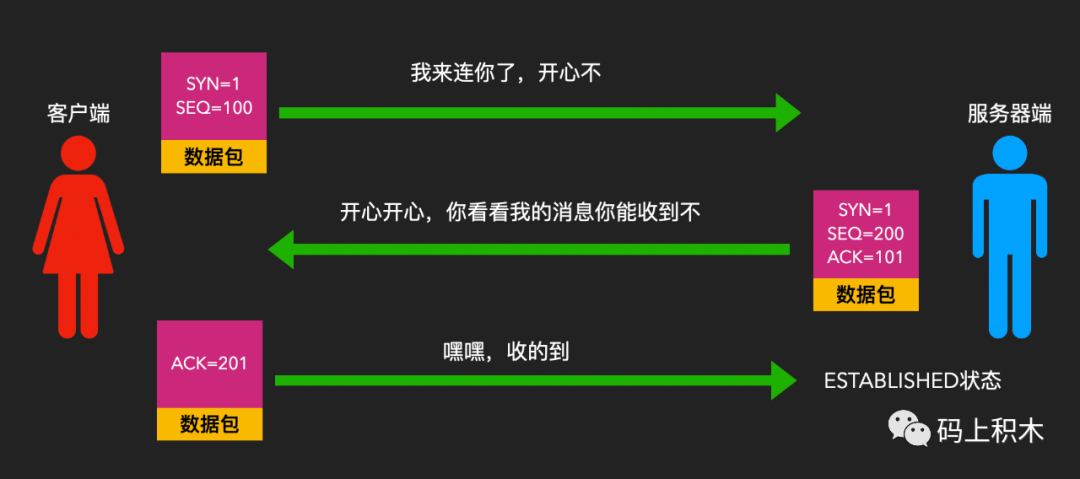 服务器端也要生成一个数据包发送给客户端,这个数据包的TCP头部会包含 三个值:表示我也要连接你的SYN(SYN=1),我已经收到了你的上个数据包的确认号ACK(ACK=SEQ+1=101),以及服务器端随机生成的一个序号SEQ(比如SEQ=200)。 -