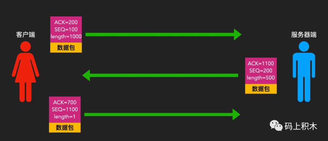 数据传输阶段有个改变就是ACK确认号不再是SEQ+1了,而是SEQ+数据长度。例如: