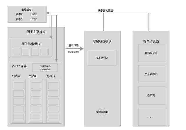 由于在圈子中有非常多需要共享信息的场景存在,例如用户相关数据、圈子基础信息等,仅仅只是基于业务模块闭环来拆分状态在此处就不适合了。