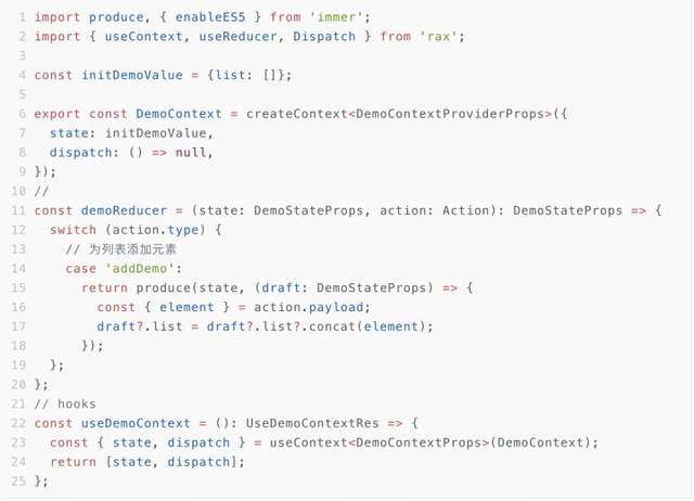 但由于是C端场景,交互复杂度不高并且考虑到资源包的大小会对用户体验有一定影响。此处的全局状态的管理方案我们选择了直接使用Rax原生的useReducer + useContext来进行处理,并将获取对应实例context 的方法Hooks化以方便开发同学使用,简单demo代码如下所示: