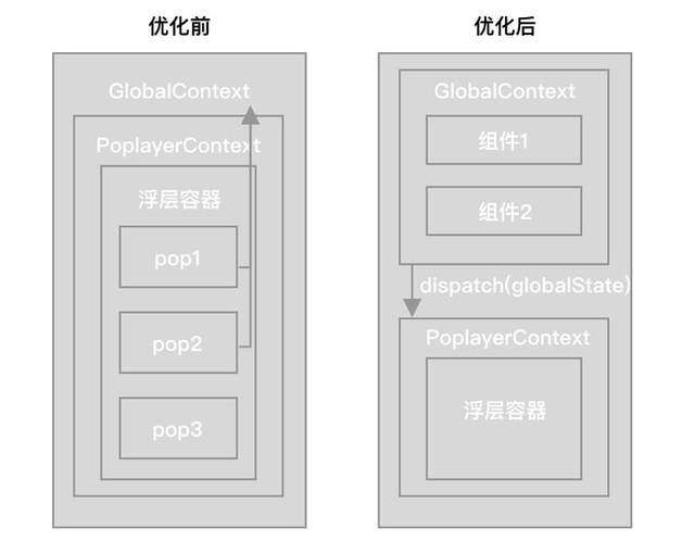 为此我们调整了浮层容器组件和主页常驻组件的层级结构,如上图所示:将常驻组件容器和层容器由原来的嵌套结构优化为了并行结构,两组件之间的数据通信通过方法调用来触发。这样调整之后优点相对比较明显:首先浮层组件可以更加通用、复用性更强。所有所需参数都是通过传参的方式传入,不需要再强依赖全局共享状态,对于开发同学来说维护起来的成本更低。其次因为减少对共享状态值的依赖,子组件不必要的重渲染也都得到了优化。对于中低端机型也能提供相对更好的互动体验。
