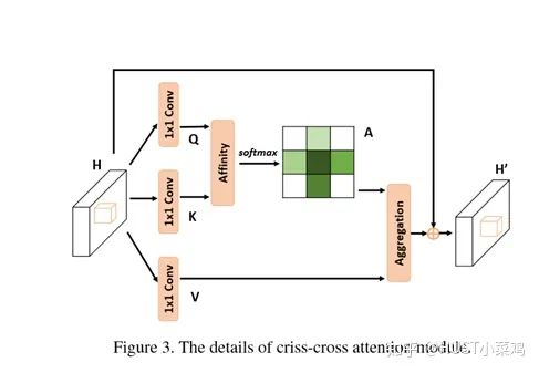 本篇文章的亮点在于用了巧妙的方法减少了参数量。在上面的DANet中,attention map计算的是所有像素与所有像素之间的相似性,空间复杂度为(HxW)x(HxW),而本文采用了criss-cross思想,只计算每个像素与其同行同列即十字上的像素的相似性,通过进行循环(两次相同操作),间接计算到每个像素与每个像素的相似性,将空间复杂度降为(HxW)x(H+W-1)