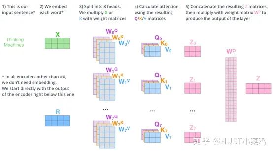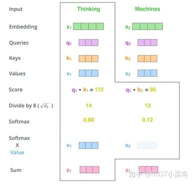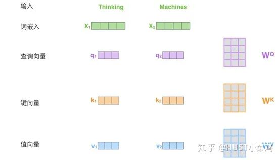 在self-attention中,每个单词有3个不同的向量,它们分别是Query向量,Key向量和Value向量,长度均是64。它们是通过3个不同的权值矩阵由嵌入向量X乘以三个不同的权值矩阵得到,其中三个矩阵的尺寸也是相同的。均是512×64。