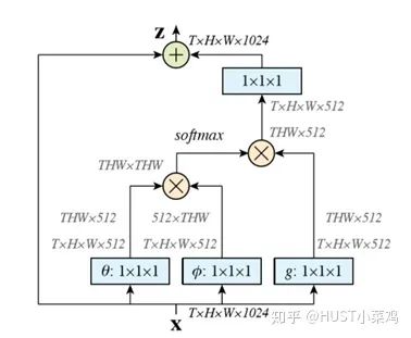 首先对输入的 feature map X 进行线性映射(通过1x1卷积,来压缩通道数),然后得到θ,ϕ,g特征