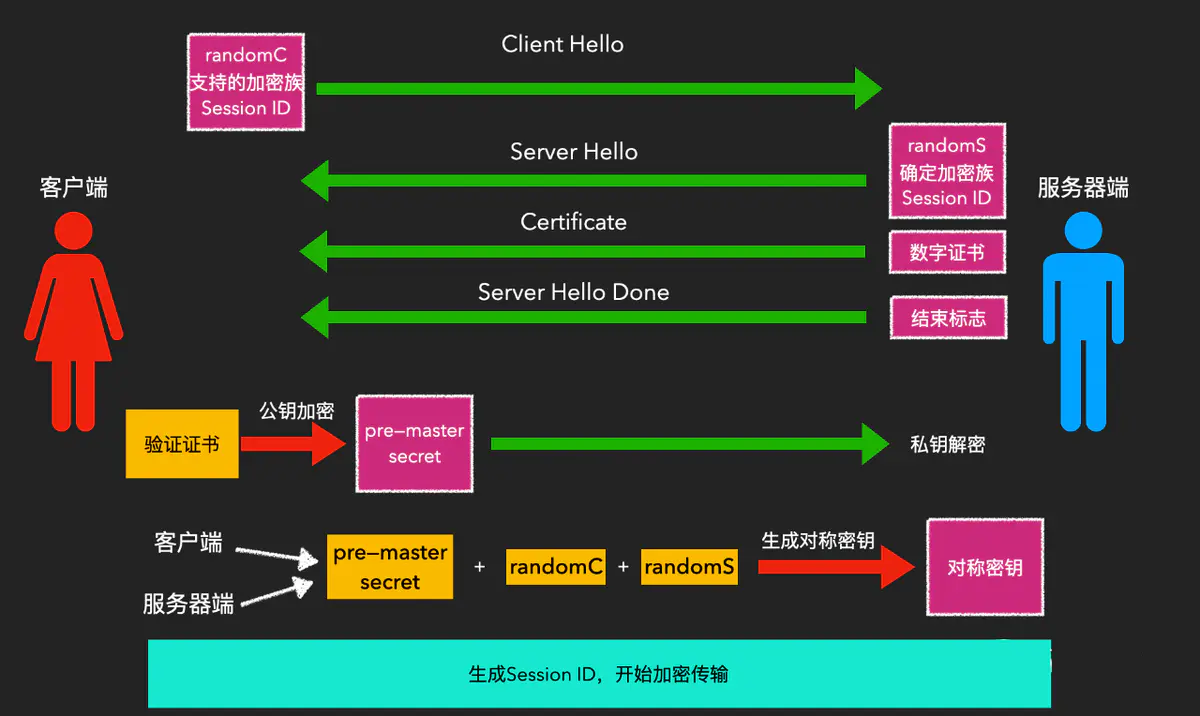 这一点刚才已经说过了,为了在断开重连后,重复连接过程,所以使用SessionID记录会话id,然后就可以重新复用定位到哪个会话了。从而减去了重复发送证书、生成密钥过程。