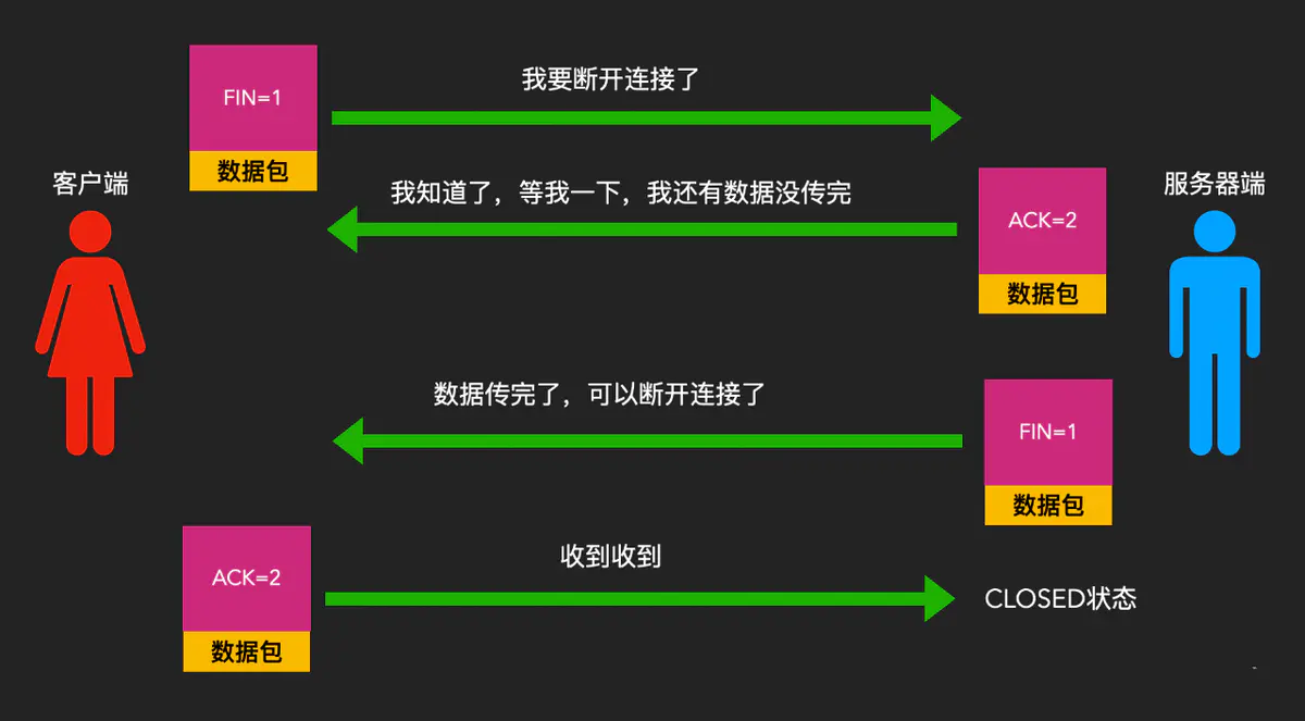 A发送断开消息给B,B回一条消息表示我收到了,这个过程就保证了A断开成功。B发送断开消息给A,A回一条消息表示我收到了,这个过程就保证了B断开成功。