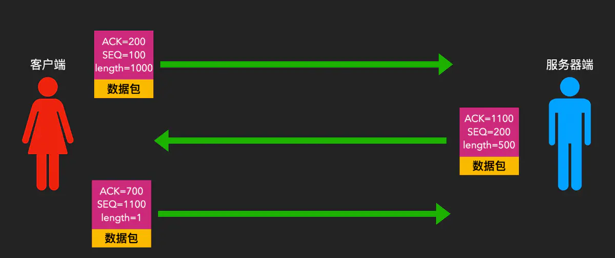 数据传输阶段有个改变就是ACK确认号不再是SEQ+1了,而是SEQ+数据长度。例如: