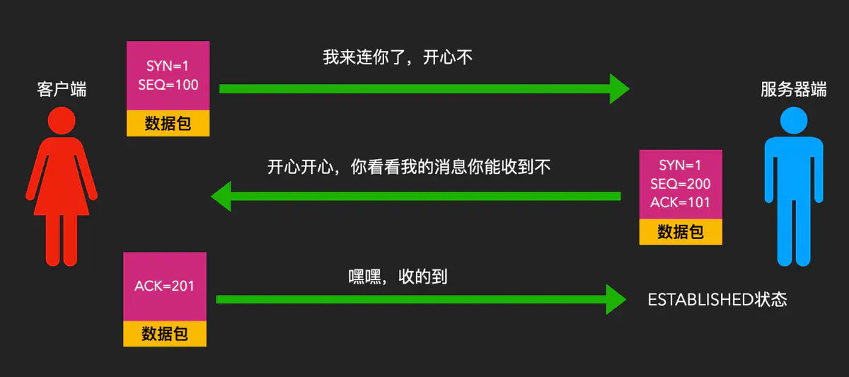 三个值:表示我也要连接你的SYN(SYN=1),我已经收到了你的上个数据包的确认号ACK(ACK=SEQ+1=101),以及服务器端随机生成的一个序号SEQ(比如SEQ=200)。 - 最后客户端收到这个消息后,表示客户端到服务器的连接是无误了,然后再发送一个数据包表示也确认收到了服务器发来的数据包,这个数据包的头部就主要就是一个