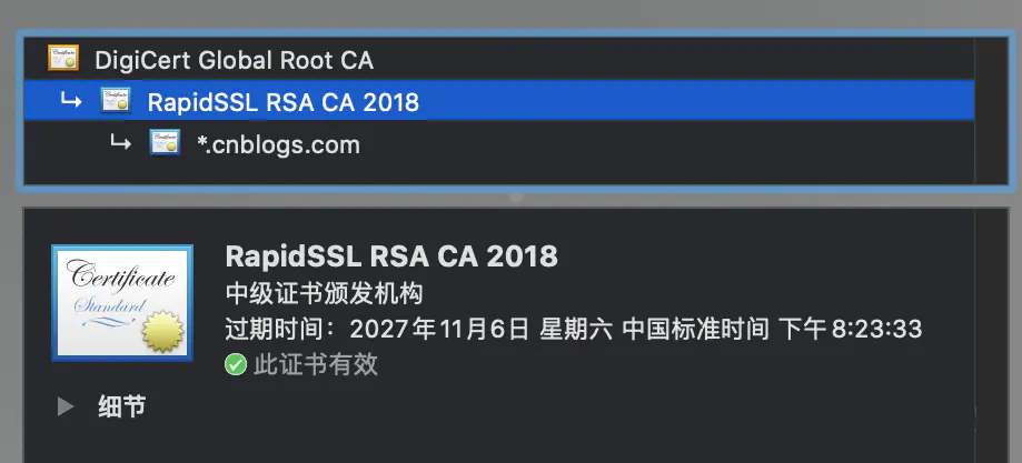 其实在服务器证书和根证书中间还有一层结构:叫中级证书,我们可以任意点开一个网页,点击左上角的🔒按钮就可以看到证书详情: