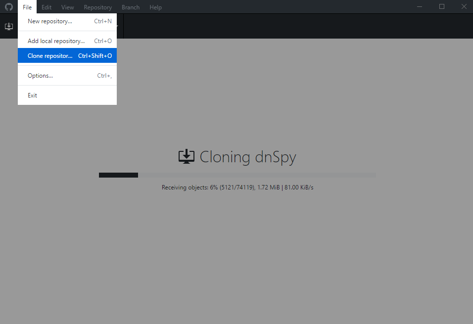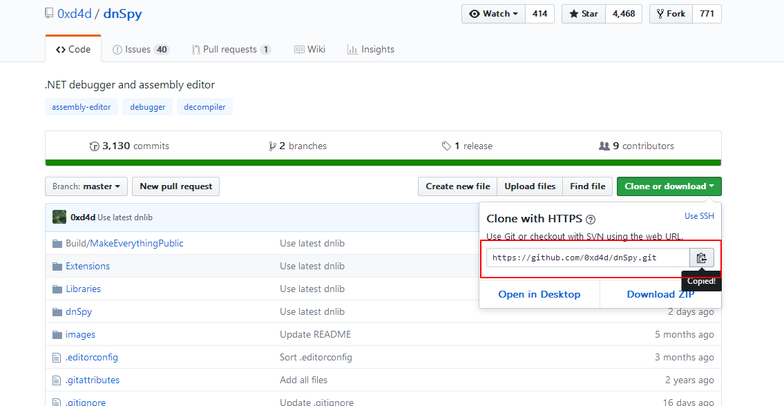 git命令在点击项目列表右边“Clone or download”获取,dnSpy的git命令:git clone https://github.com/0xd4d/dnSpy.git
