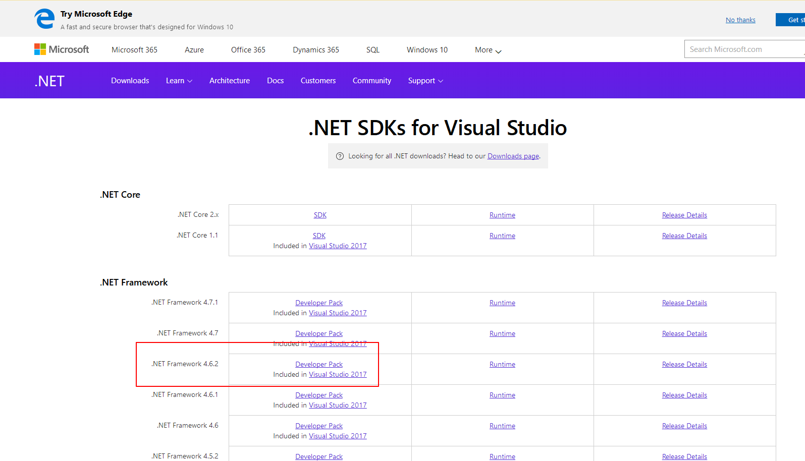 打开 .NET SDKs for Visual Studio ,下载.NET Framework 4.6.2 的Developer Pack 安装