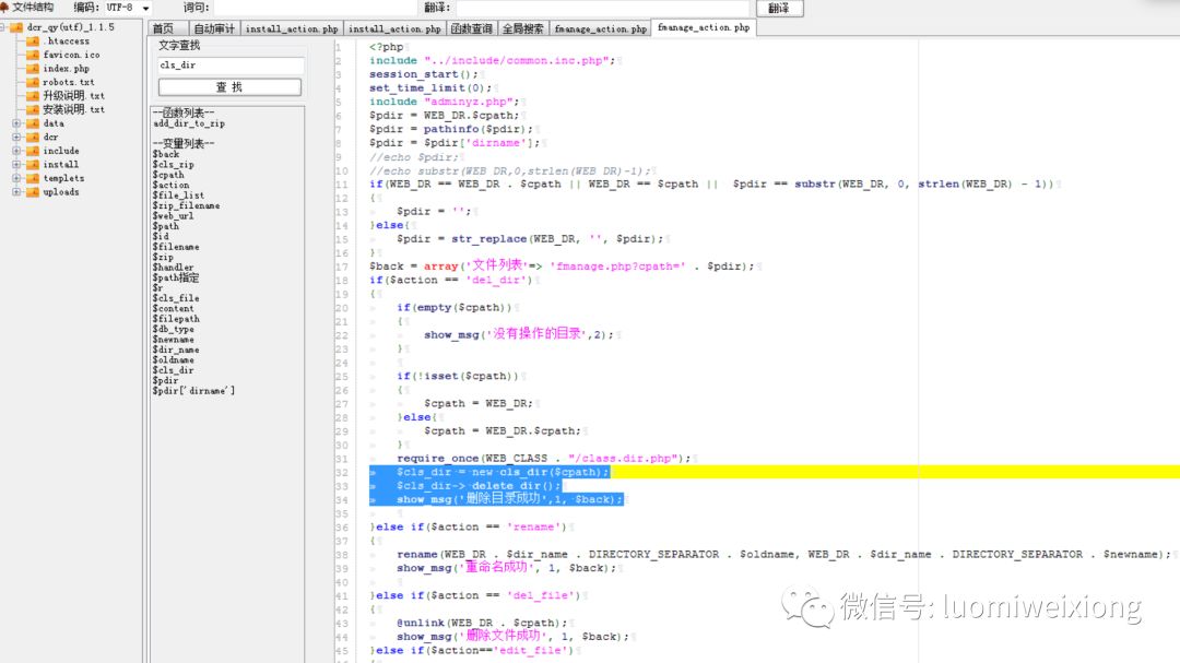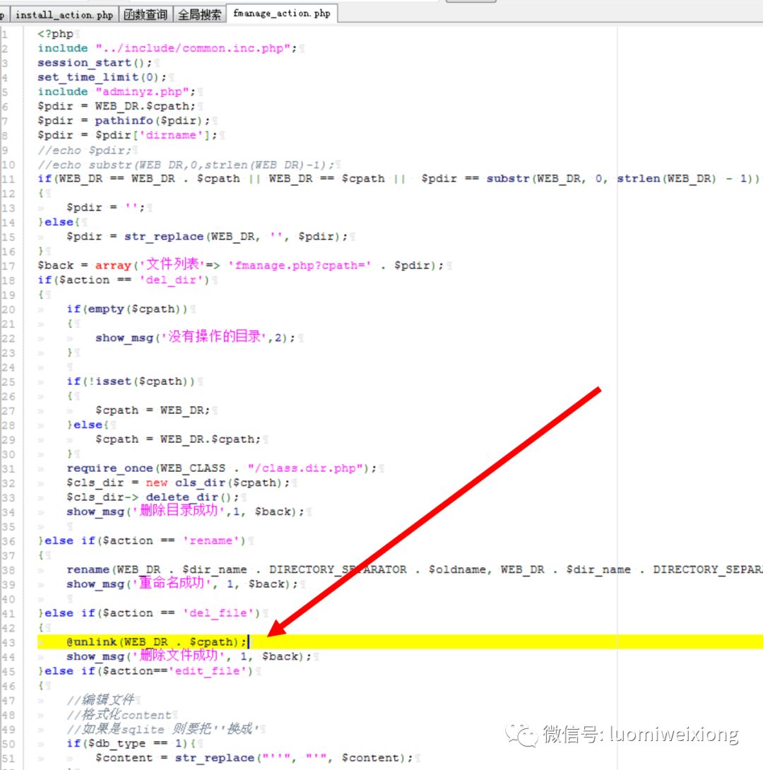 姿势1、在fmanage_action.php中提供了文件删除功能,但是未对文件路径做过滤,于是可以删除任意文件