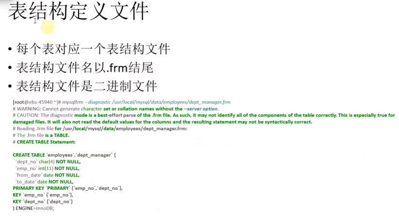 # CAUTION: The diagnostic mode is a best-effort parse of the .frm file. As such, it may not identify all of the components of the table correctly. This is especially true for damaged files. It will also not read the default values for the columns and the resulting statement may not be syntactically correct.