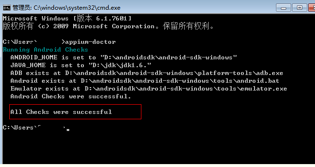 7、appium-doctor appium安装好后,找到这个文件目录D:\appium\Appium\node_modules.bin ; 将上面的地址添加到环境变量path下 打卡cmd,输入appium-doctor,检查环境是否OK,出现如下图所示,说明环境OK