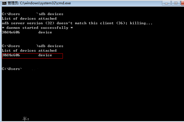 3、手机用数据线连电脑,如果安装了91助手或者360什么的可以先下载手机驱动,确认手机能连上 4、打开cmd输入:adb devices,当屏幕上出现一串字符,后面显示devices说明连接成功(出现其它的提示,得检查自己的环境了)