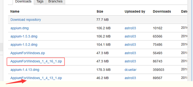 3、出现如上图信息,表示node.js安装成功。npm是一个node包管理和分发工具,有了npm,后面就可以输入指令在线安装appium(打开 cmd输入:npm install –g appium但是一般不推荐这种,下载比较慢,所以用下面这种客户端安装) 4、下载appium: 下载安装地址:https://bitbucket.org/appium/appium.app/downloads/16 下载如图箭头中的版本,选中的版本好像下载不了;