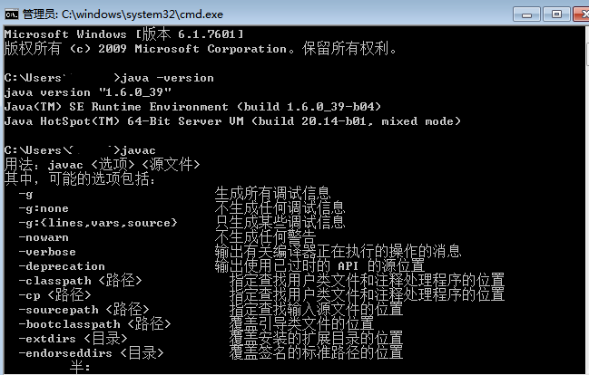 4、PATH-----;%JAVA_HOME%\bin;%JAVA_HOME%\jre\bin; 在path路劲下边加上上边的就可以了 5、打开cmd然后输入java -version,然后输入:javac,能显示如下的版本号和帮助信息就说明,安装成功了