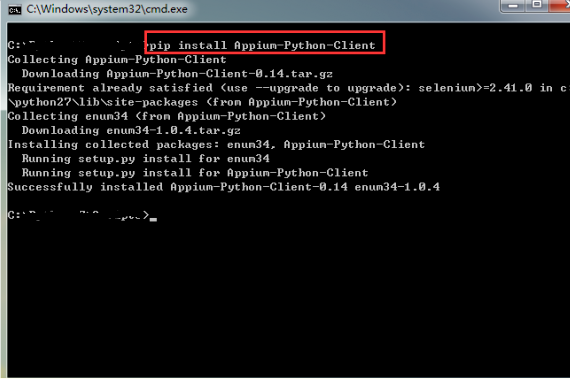 8、安装Appium-Python-Client 前面python环境安装,已经准备好pip了,所以这里直接打开cmd,输入:pip install Appium-Python-Client