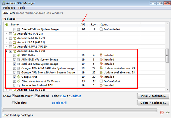 7、勾选你要现在的API版本和对应的android版本,然后等待下载,安装 8、在系统变量新建:ANDROID_HOME,对应变量值为:D:\androidsdk\android-sdk-windows(sdk安装路径) 9、path添加两个变量,将以下箭头所指的两个文件路径添加到path里