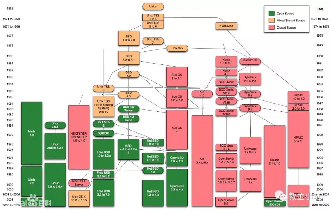 不仅如此,由于unix的开源特性(即开发源代码),基于unix还衍生出了众多子系统,如下图: