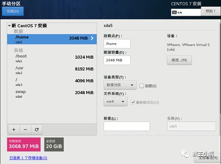 /home 2G ext4 注:home目录是系统中所有用户的家目录存放位置。家目录即每个用户在系统中的专属文件夹,其他用户不可访问。