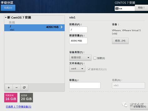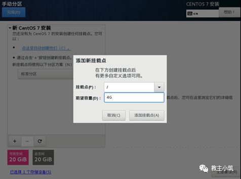 点击下侧“+”号,开始创建分区,由于Linux所有文件的总目录为 / ,所以根目录是必须要做分区挂载的,案例暂且划分4G,空间足够就好,一般没有特殊规定的大小