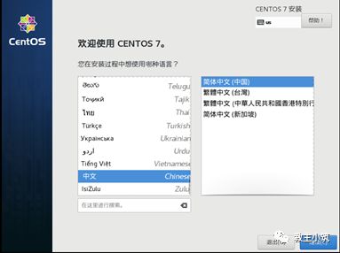 稍等后进入图形化安装界面,首先是让选择安装过程中的语言,我们选择中文。(注:此处并非是选择系统安装完毕后的运行语言。)