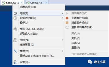 最后,右键虚拟机的标签,选择“电源”项,也可以实现关机、挂起(即休眠)、重置(即重启)等功能。