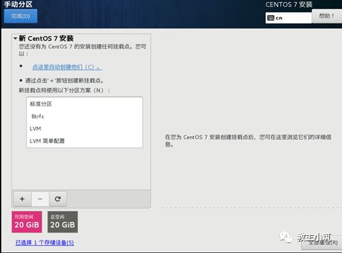 手动分区中,首先选择”标准分区”模式,默认显示的是”LVM”,标准分区和LVM分区的区别会在后续磁盘管理章节中介绍,此处暂略,仅说明:Linux系统一般安装在标准分区下,比较稳定。