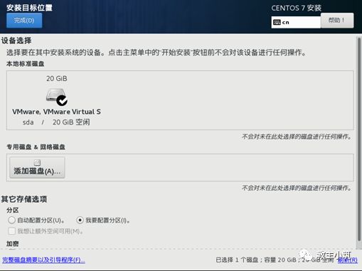 安装总览界面中选择“安装位置”后进入磁盘管理界面,可选择下侧的“我要配置分区”进行手动分区,点击“完成”后进入分区界面。