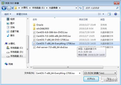 选择“CD/DVD(IDE)”选项,为虚拟机光驱放入系统安装光盘,我们选择事先准备好的centOS-7-x86_64-Everything-1708.iso版本