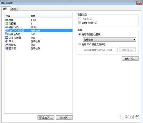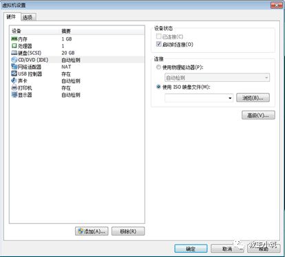 我们将设置网卡连接方式为“桥接”,即虚拟机网卡连接到本物理机真实网卡,则虚拟机可通过真实网卡的网络连接,通信到局域网路由器,即可上网。另根据实际需要,可以在增加一块网卡或其他硬件(点击下侧的添加按钮即可选择)。其他仅主机模式和nat模式,暂略,之后章节会有介绍。