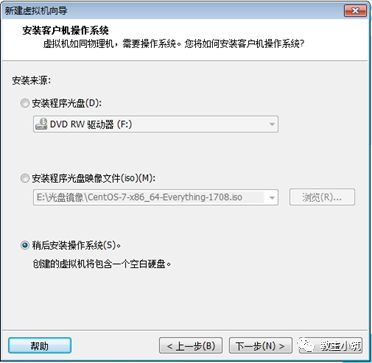 在这里请选择“稍后安装操作系统”,因为如果直接选择第二项,指定光盘镜像,则vmware会自动识别镜像版本,按照最小化安装模式自动安装Linux系统,则系统很多程序包不会安装,以致影响后续的很多操作,添加复杂度。