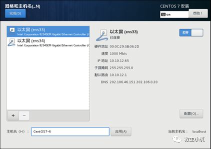 安装总览界面中选择“网络和主机名”后,可配置本机主机名,和网卡,一般开启一块网卡即可,具体网络配置会在之后章节中介绍。