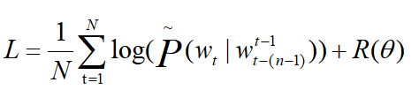 为预测出来的真正下一个词概率,R为正则项,用于训练时减轻过拟合。N代表一次训练输入词的个数。
