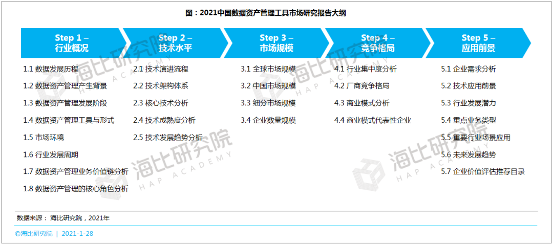 为此,海比研究院联合中国软件网,将于2021年3月11日举办报告发布会,首发《2021中国数据资产管理工具市场研究报告》。该报告主要基于海比研究院对中国企业级数据资产管理工具方面的长期追踪研究与观察,结合对中国市场代表性企业的调研,利用定性和定量相结合的研究方法编写完成,希望帮助供需两端破解企业数据资产管理过程中所面临的问题,以及现阶段市场发展现状与发展趋势,为推动中国企业级数据资产管理的应用与普及贡献研究的力量。