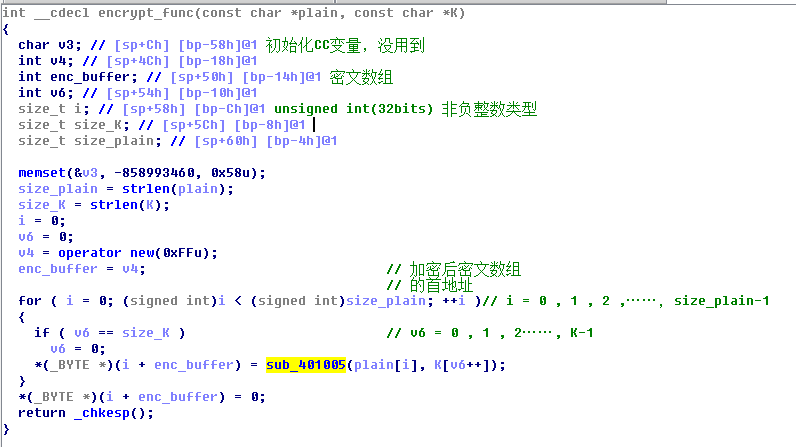 可见,他是明文字符 plain[i] 和密钥字符 K[v6] 加密填入enc_buffer[i],因此密文长度等于明文长度,验证了前面的判断。
