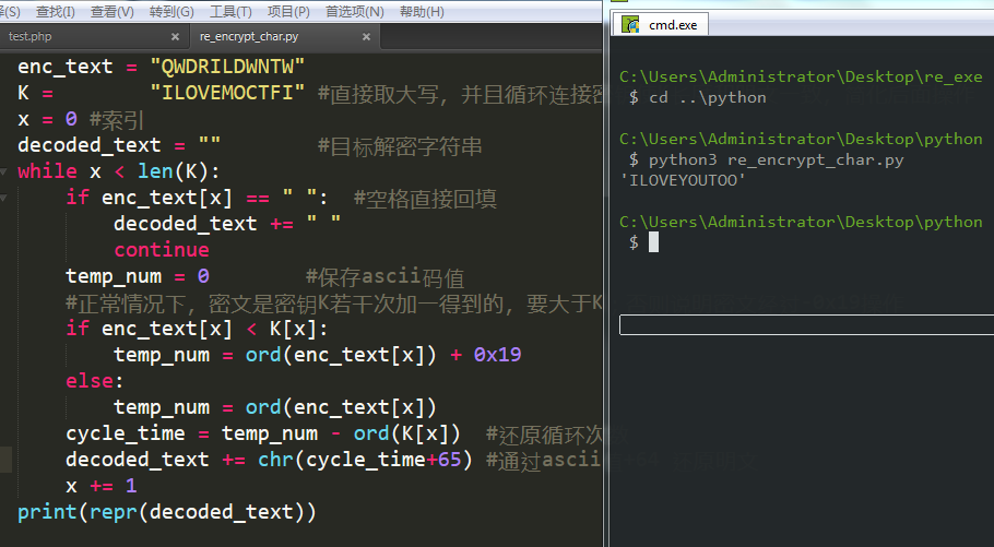 K = "ILOVEMOCTFI" #直接取大写,并且循环连接密钥使K长度和明文一致,简化后面操作