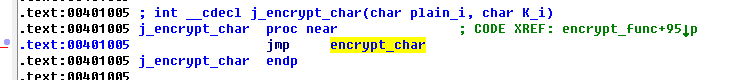 好,现在重点分析sub_401005地址,又是一个跳转,我命名之为encrypt_char函数