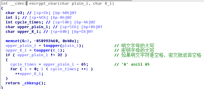 逻辑十分清楚了,名文字符、密钥字符取得大写,判断不是空格后开始加密(再次验证开头关于空格不加密的判断),由明文的ascii-‘A’的ascii(65)得到这一次函数循环的次数,循环更简单,就是每次把密钥的ascii值加1。我们通过函数流图看看后续操作(伪代码后面的结束步骤返回不详细)。