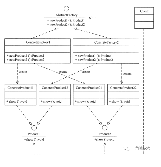 - ConcreteFactory : 具体工厂角色,它实现了在抽象工厂中定义的创建产品的方法,生成一组具体产品,这些产品构成了一个产品种类,每一个产品都位于某个产品等级结构中,如上述类图中的 ConcreteFactory1 、ConcreteFactory2。