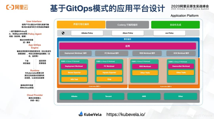 接下来,简单介绍下这个应用平台的组成,从上到下,第一层是用户界面层,开发者可以通过界面 UI,或者 cuelang 一种脚本语言来对应用进行编排,其中 cuelang 模式是显性的代码化,而 UI 是帮助用户生成代码。