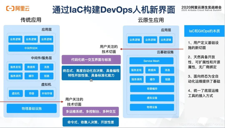 IaC 和 GitOps 的模式对比传统 DevOps 工具最大的区别是什么?是 用户关注切面的变化。传统模式需要使用多运维系统、多控制台、熟悉多种交互方式。使用命令式模式操作基础设施变更,此时下层工具只提供原子能力,而人去控制原子能力的执行顺序,以及观测、回滚等等。这就像开一个手动挡的车一样,需要了解如何换挡,转速控制,以及油离配合。而新模式下,可以通过代码去统一定义基础设施,只描述终态。此时有一个高度自动化和智能化的运维系统,可以帮助我们去安全高效的完成变更。就像在开一个有自动驾驶功能的汽车一样,只需要告诉他要去哪。