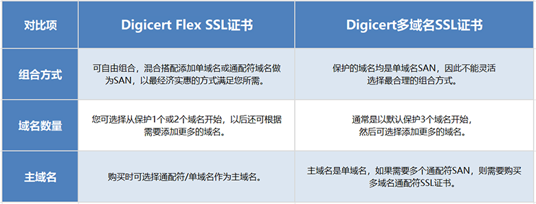 相比于Digicert旗下传统的SSL证书,Flex系列SSL证书最大的特点就是灵活性和可扩展性:一张Flex SSL证书允许您随时自由搭配、混合添加多达250个单域名或通配符SAN(默认保护1个单域名或通配符域名),用最经济的组合方式准确地满足您的需求。