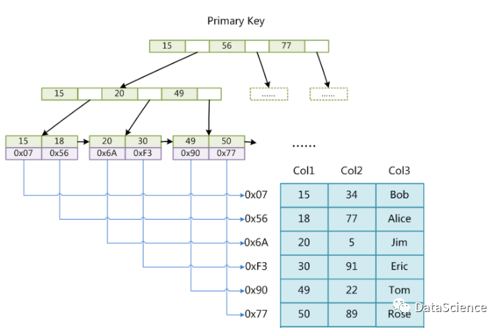 主键上带有索引,存放在B+Tree结构中,第三行是叶子节点,存放的是地址信息,根据地址信息指向磁盘中数据库文件中这一索引所在的行,找到行后再返回数据,磁盘进行了多次的I/O,速度较慢, 是非聚簇索引的结构。